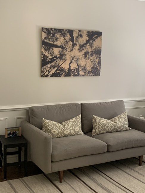 Benjamin Moore’s Ashley Gray is a beautiful rich gray (here’s a comparable online version). It pairs nicely with gray wood furniture and whites. With a LRV of 32.38 (see how low this is?), this shade has much more depth to it than the other colors we leaned towards in our house. We thought this was an excellent dining room shade, where we have our son set up for online learning this year.